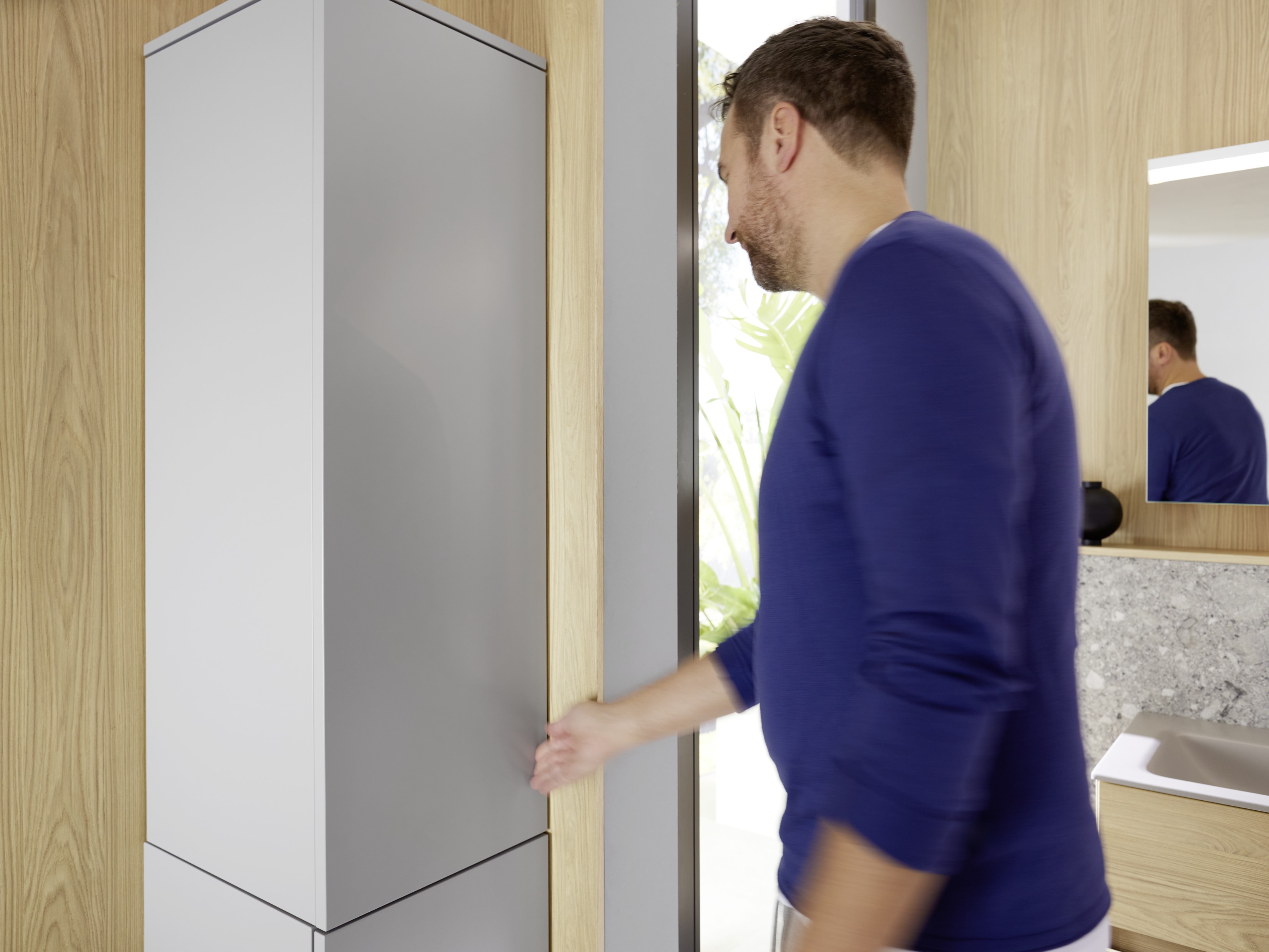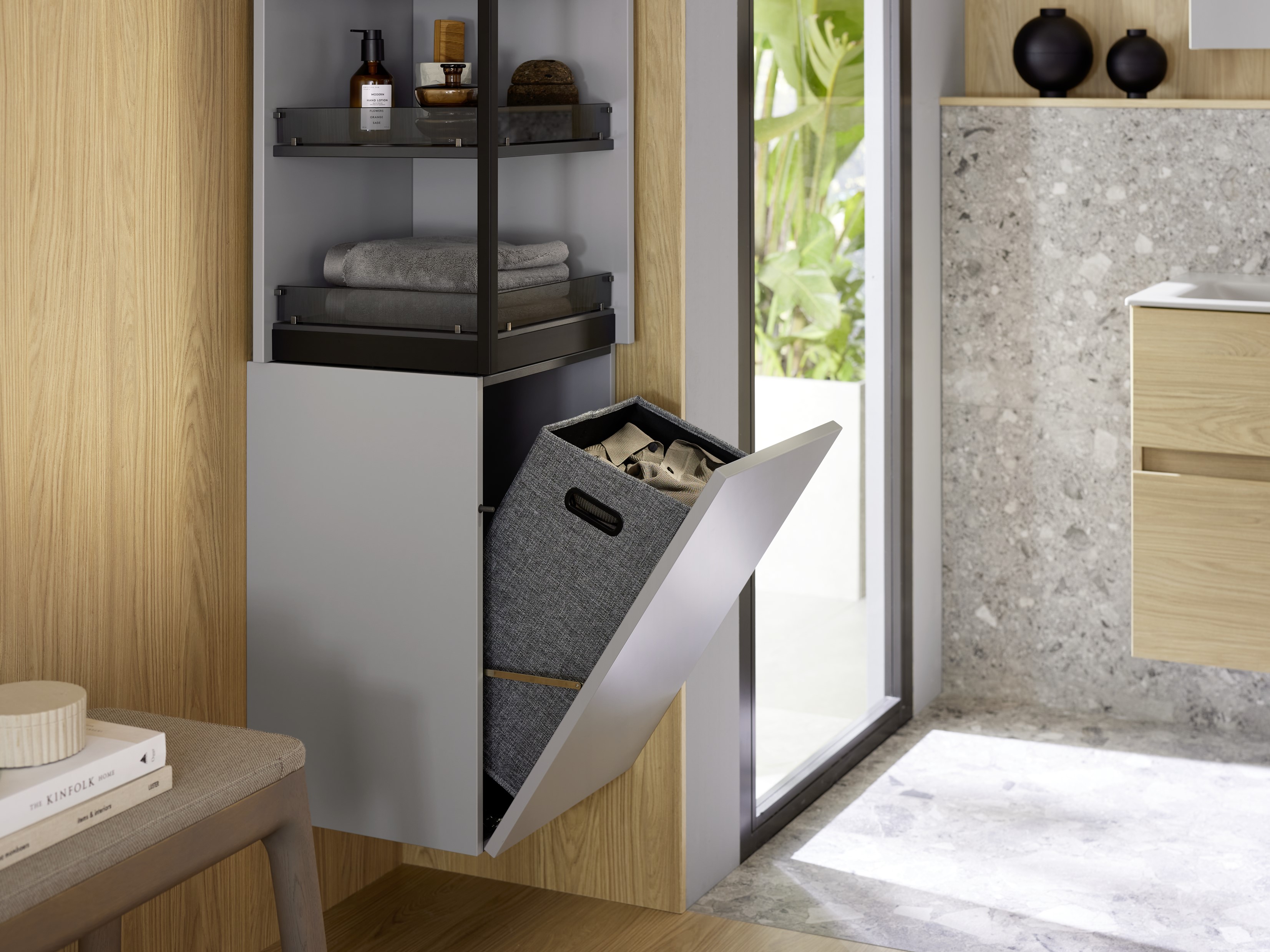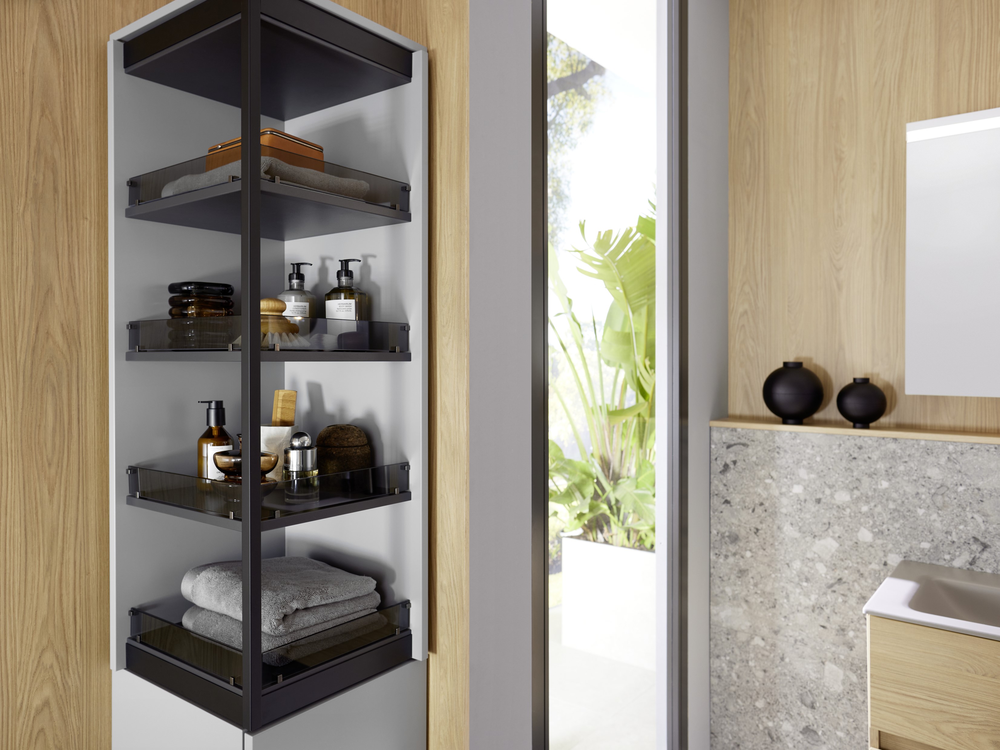 MagicTwist ist ein Hochschrank fürs Bad, der gleichzeitig ein offenes Regal ist. Mit einer Rotationsbewegung wird der Badschrank geöffnet, ein übersichtliches Regal wird sichtbar, das den Zugriff auf alle Produkte im Schrank bis in den hintersten Winkel ermöglicht, ohne dass dabei Türen im Weg stehen. Ein neuartiger Drehbeschlag macht das möglich, das Drehmoment ist so ausbalanciert, dass beim Öffnen nichts vom Inhalt verrutschen kann. Im unteren Teil des Hochschranks ist eine praktische Wäschekippe mit Stoffkorb integriert. Geöffnet wird MagicTwist über Tip-On-Technik, zum Schließen kann man die senkrechte Metallstrebe des geöffneten Regals benutzen. Die platzsparende Öffnungsweise ist optimal, um in kleinen Bädern oder schmalen Räumen Stauraum zu schaffen.